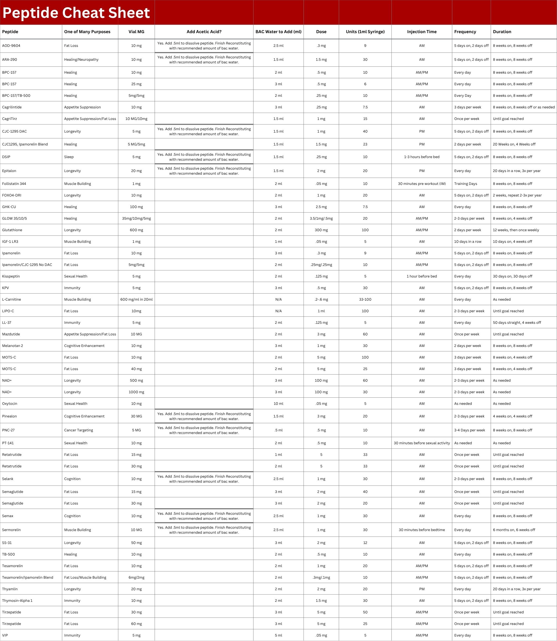 Chart with many peptides in one place. This chart shows dosing and duration for all products.